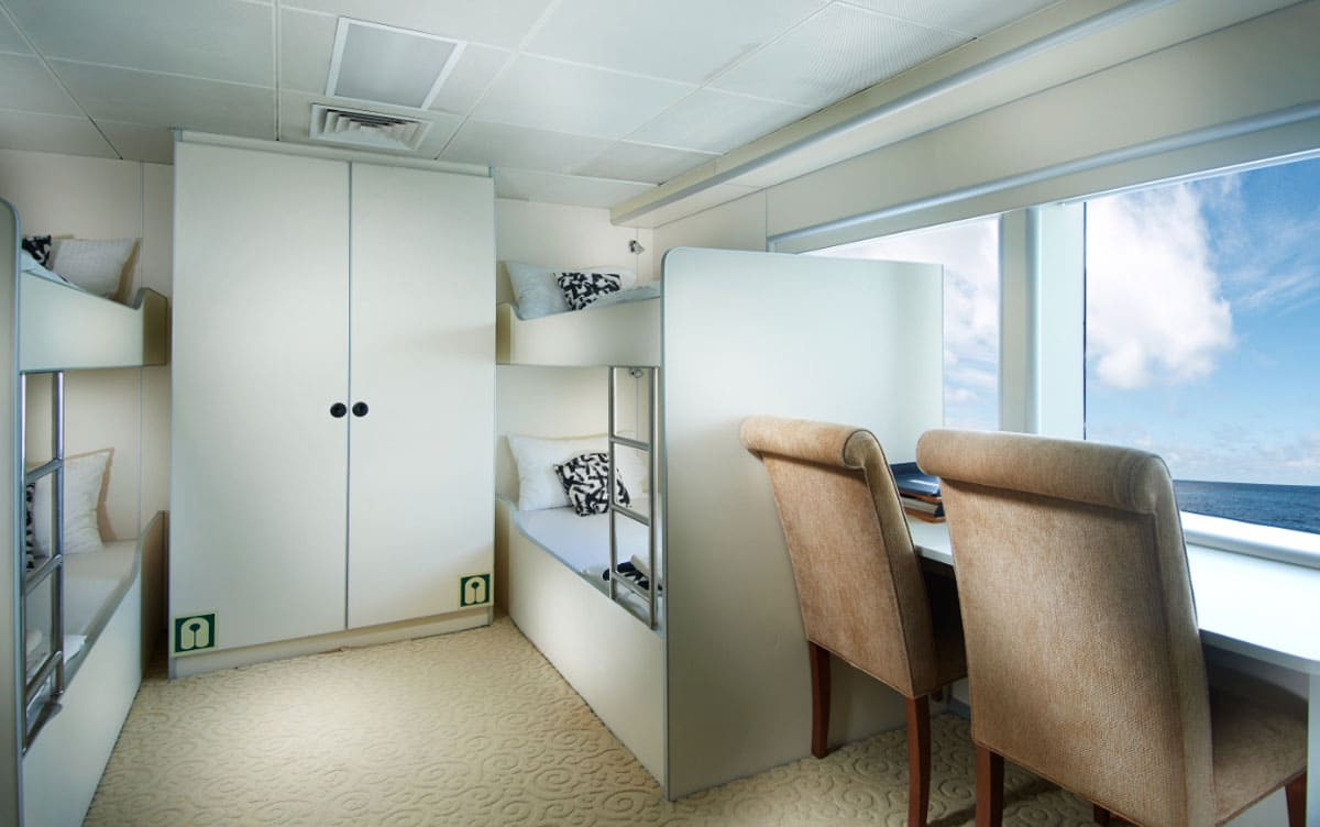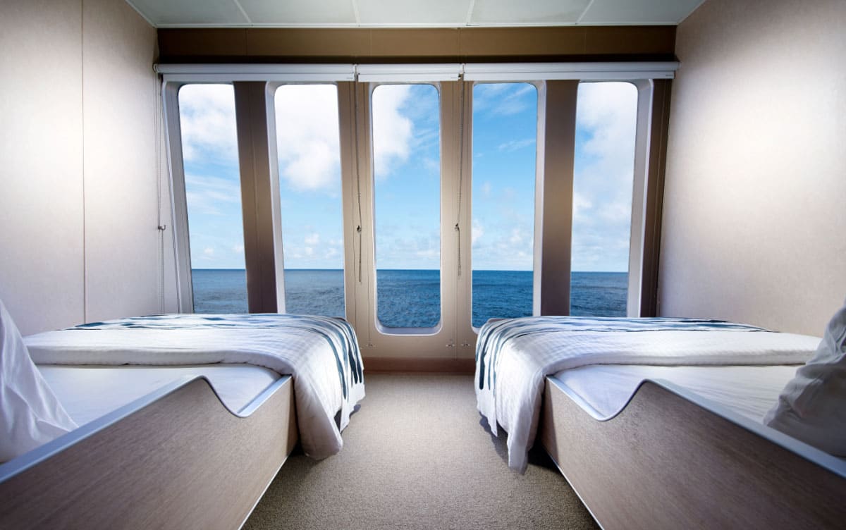 Cada cabina tiene baño privado con duchas de agua caliente y fría, aire acondicionado, secador de pelo, toallas, jabón para baño y champú. Las cabinas están ubicadas en la cubierta principal o en la superior y todas cuentan con amplias ventanas para disfrutar de la vista.